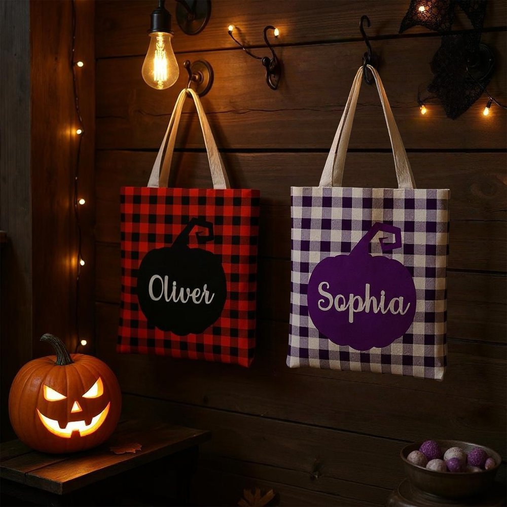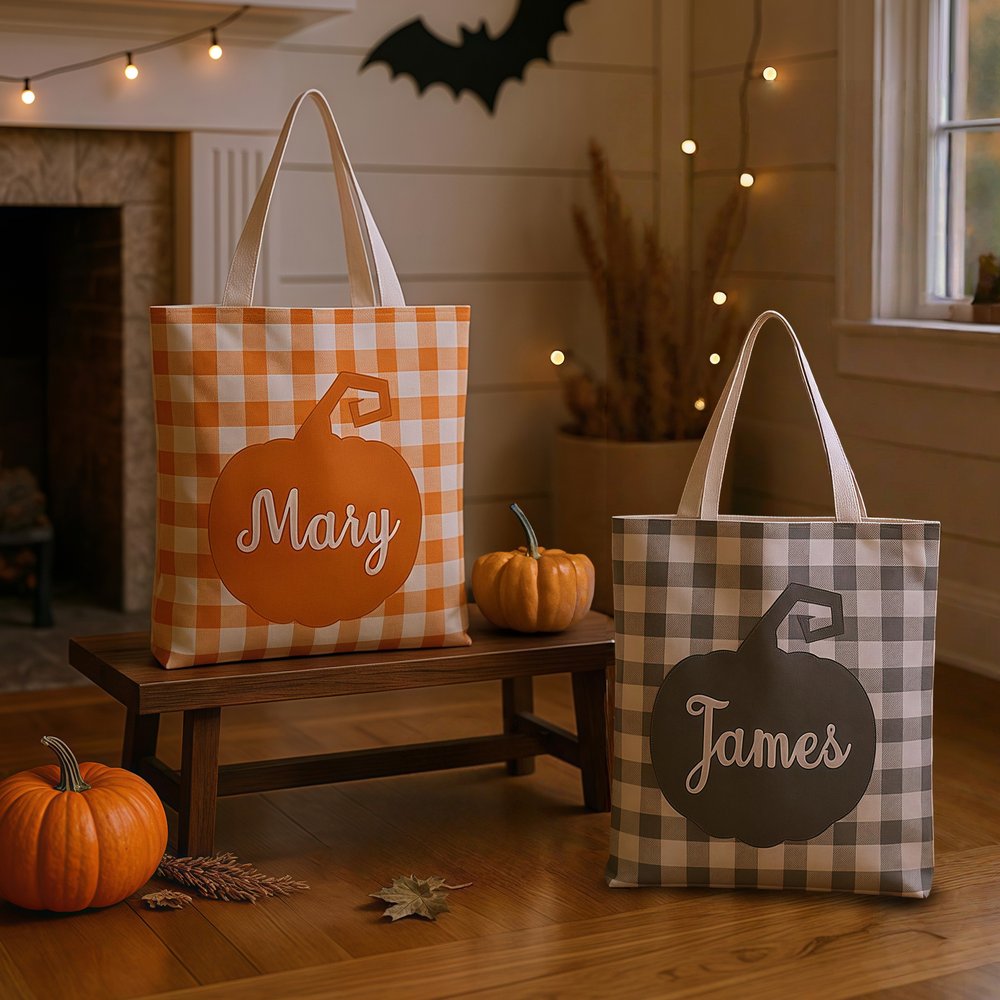 Our bag features a stylish checkered background, complemented by a unique pumpkin silhouette in your chosen color. Each bag radiates a warm autumn vibe, making it a fashionable and practical accessory. You can customize your name on the pumpkin, ensuring that every bag is a one-of-a-kind choice that reflects your unique style.