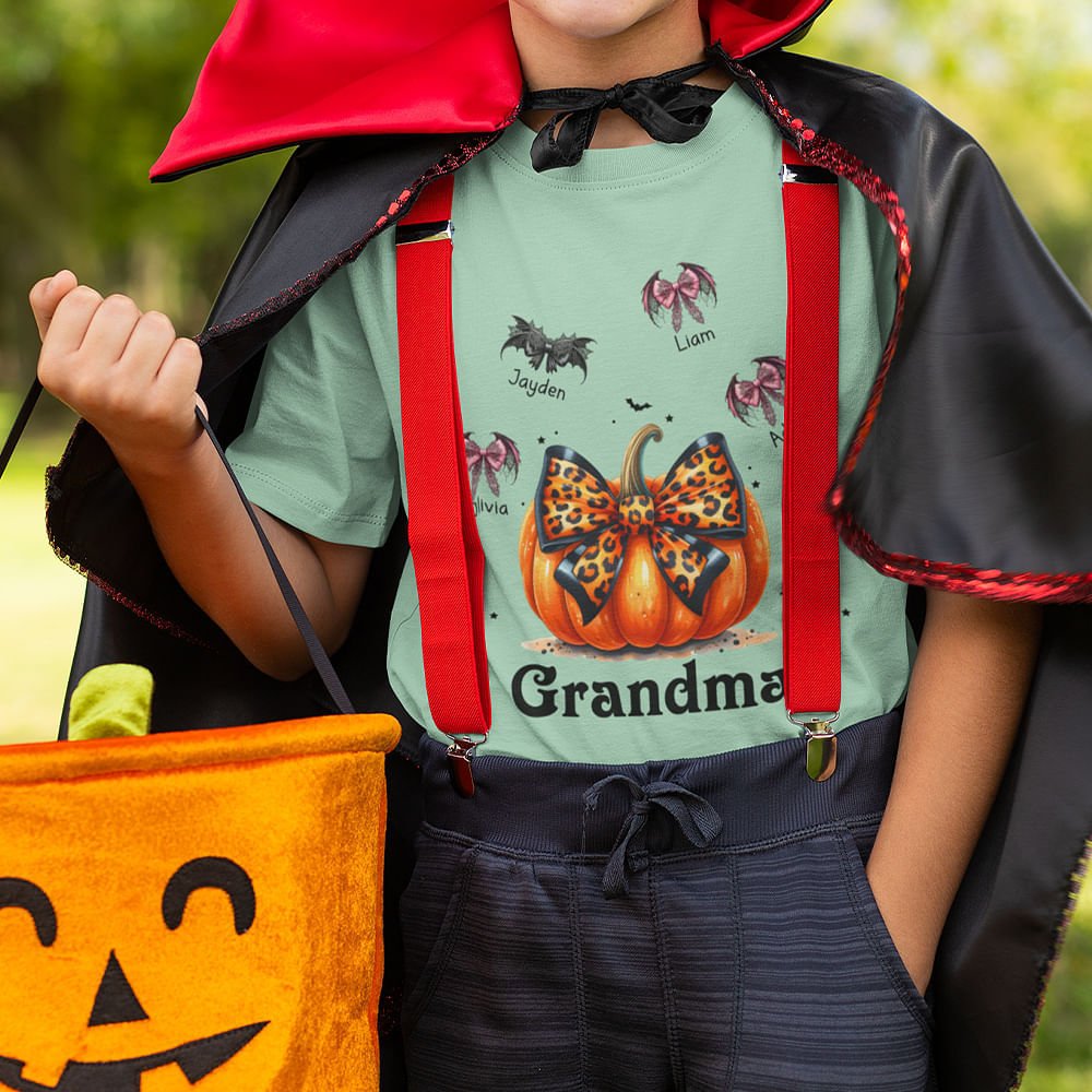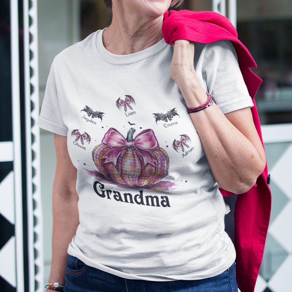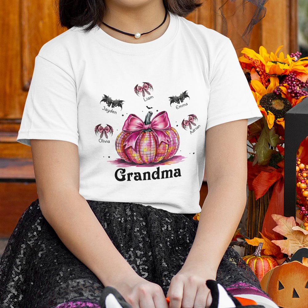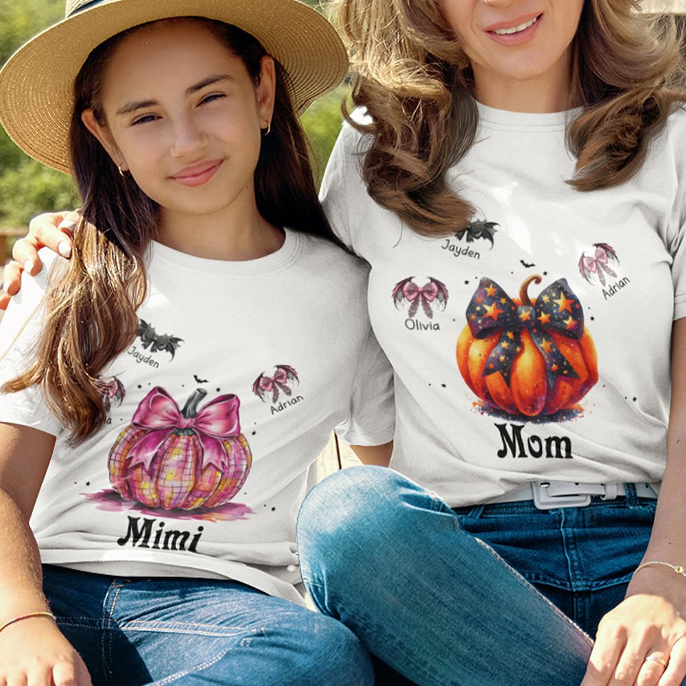 This T-shirt is inspired by the classic elements of Halloween - pumpkins and bats, and cleverly incorporates a coquette bow style bow. Each bat represents a family member. It embodies the essence of Halloween and is a must-have item for anyone who loves to celebrate this holiday.