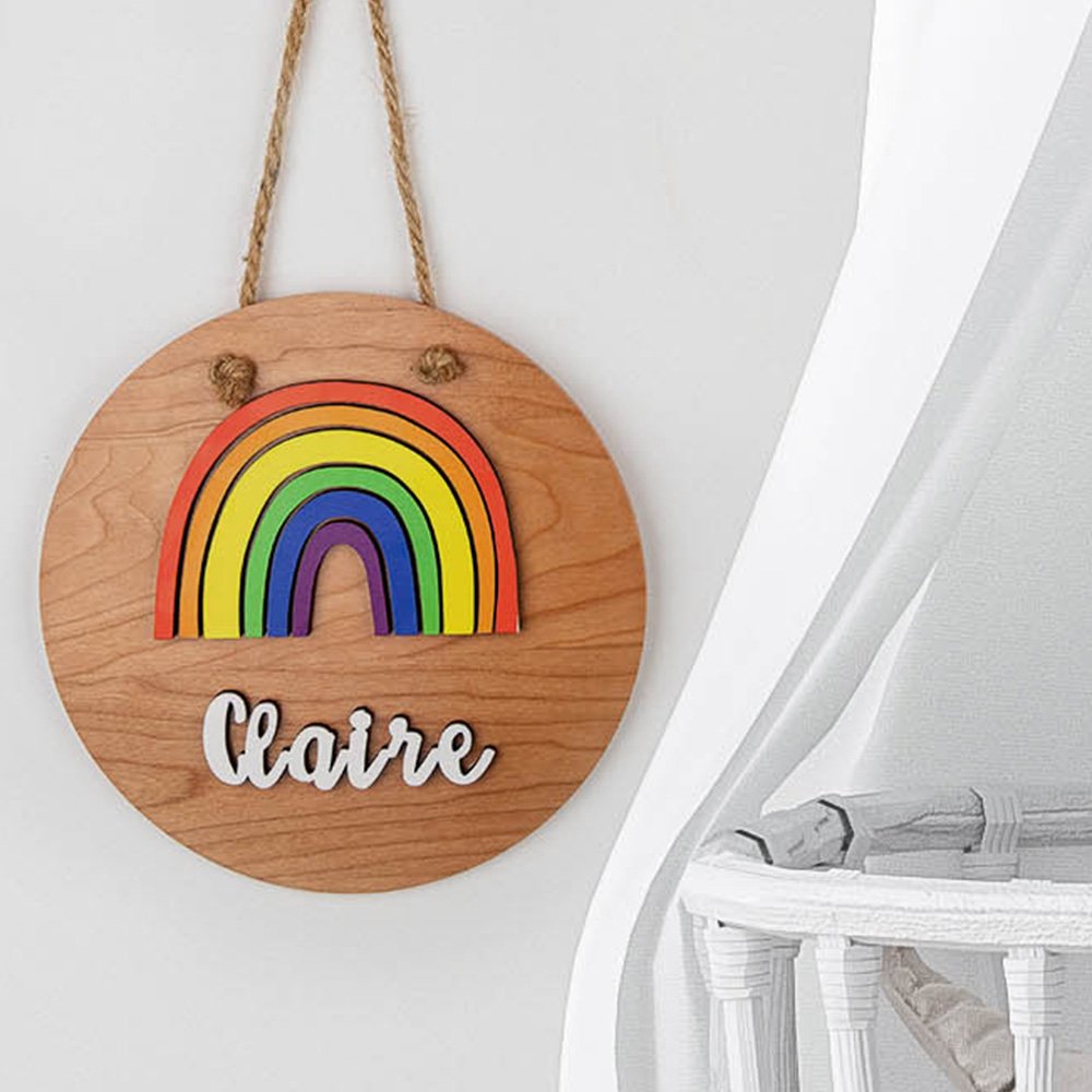 • The color of wood, matched with rainbow colors, makes the name sign full of vitality and colorful. You can carve small names on wood to make a cute and unique name ornament. For those who like children or have newborns at home friends. Hang on the door, wall, or anywhere in the house. This pendant conveys a positive and sunny attitude and is also a good wish for the newborn baby.
