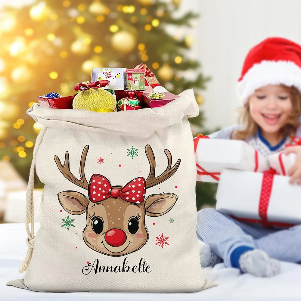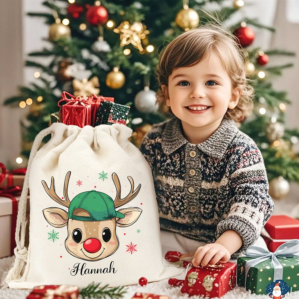 Featuring an adorable reindeer wearing a bow or hat and adorned with snowflakes, this Christmas sack adds a festive touch to your holiday celebrations. Customize it with a name to create a unique treat bag that stands out during Christmas parties.
