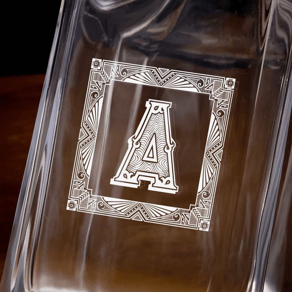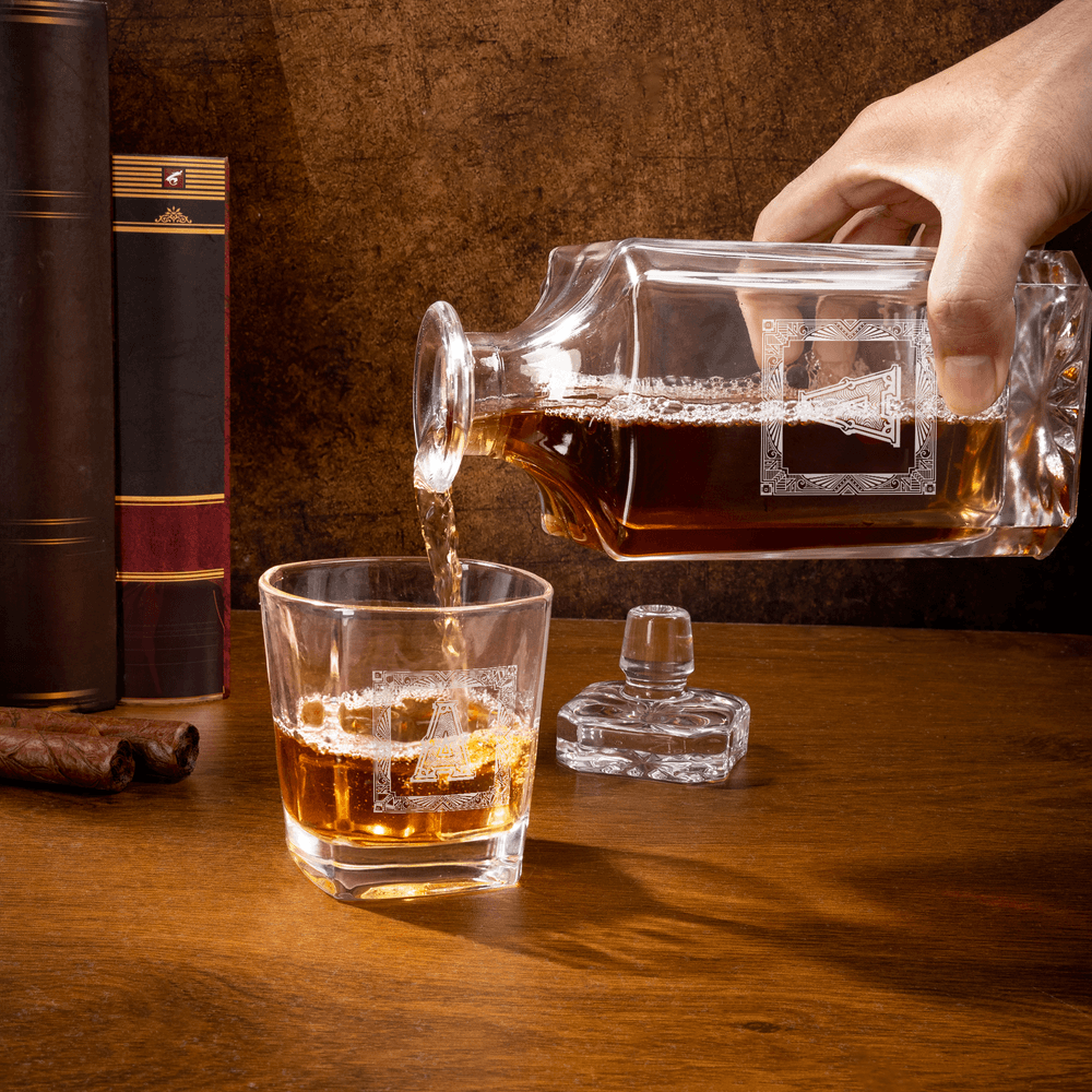 The decanter set and wooden box feature engraved craftsmanship, incorporating initials and vintage-inspired border patterns. This custom design lends the set distinctive recognition, elevating ordinary drinking vessels into commemorative pieces worthy of long-term collection—blending practicality with collectible value.