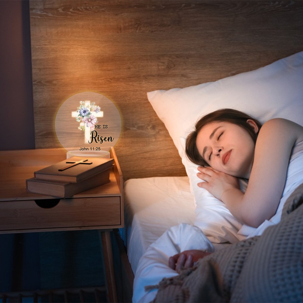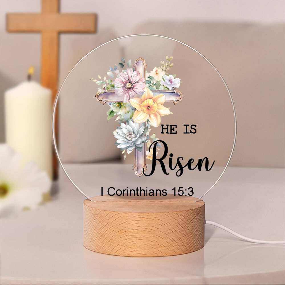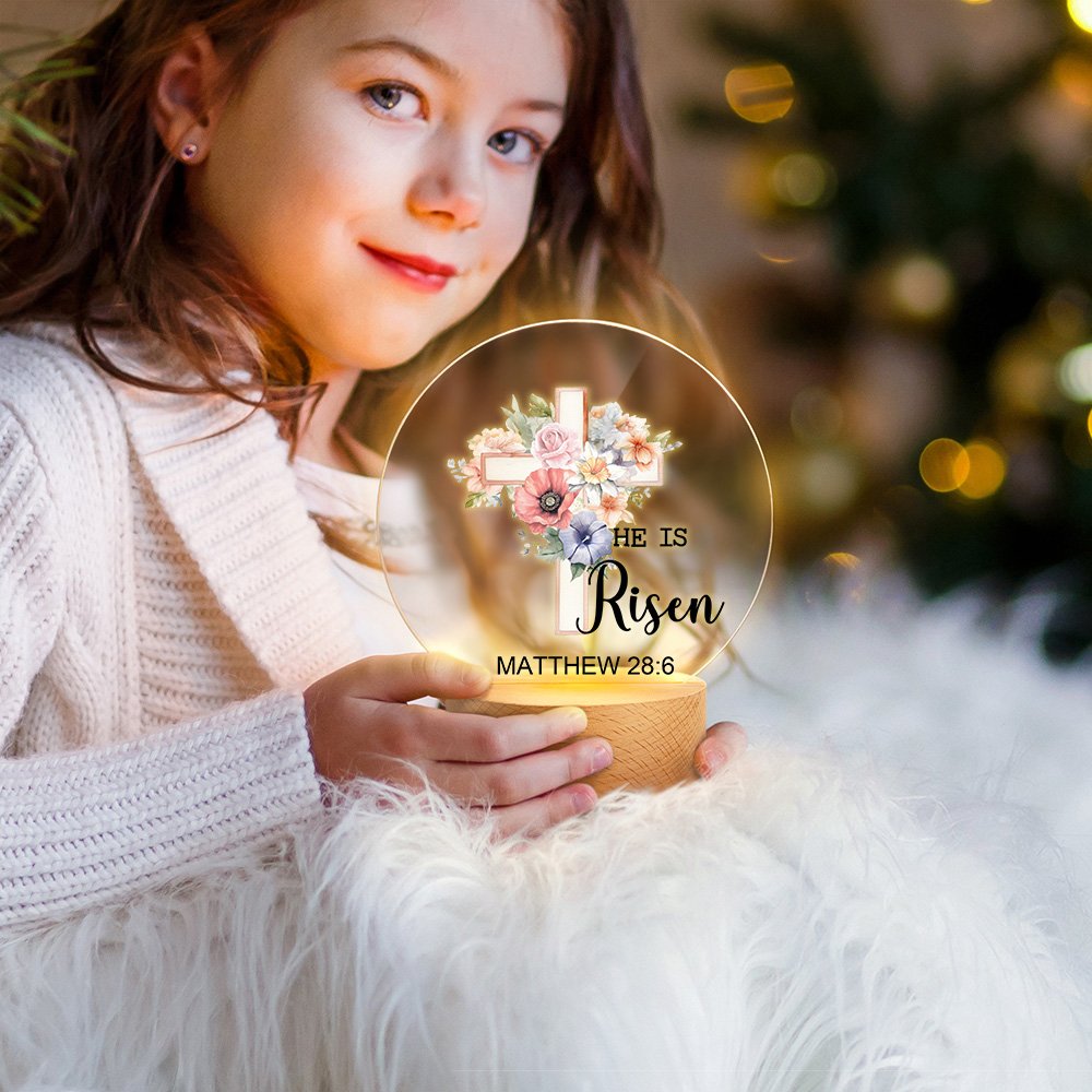 This is an Easter cross birthday flower night light. Each flower represents a different birth month, implying unique blessings and beauty, and contains the text HE IS Risen. You can customize 12 different Birth flowers and six crosses. You can choose the Bible chapter MATTHEW 28:6 or add the Bible chapter you want, making this gift instantly unique and full of love and blessings.