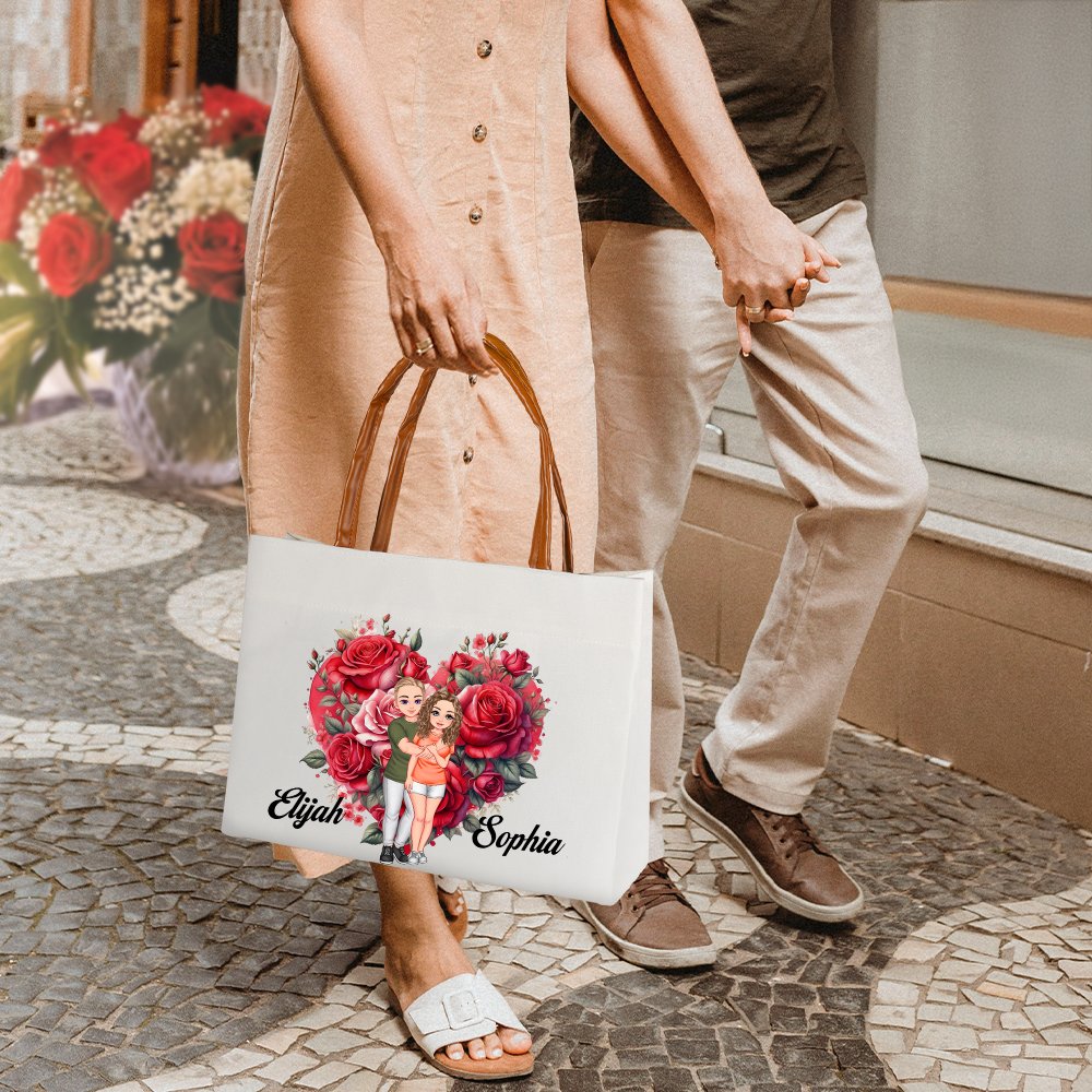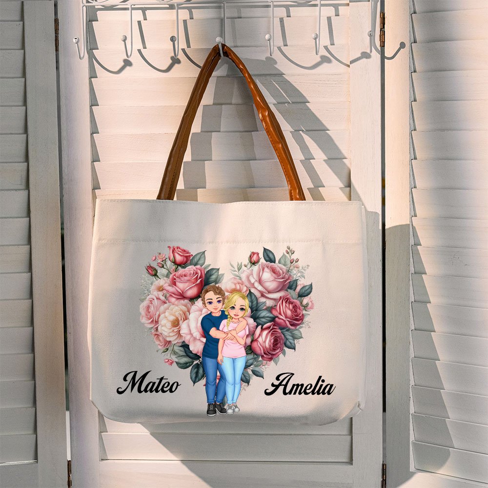 This tote bag, featuring cute cartoon couple illustrations and a heart made of flowers on the back, is a beautiful expression of love. Customize it with both names for a unique, personal touch that turns this accessory into a cherished keepsake for couples or newlyweds.