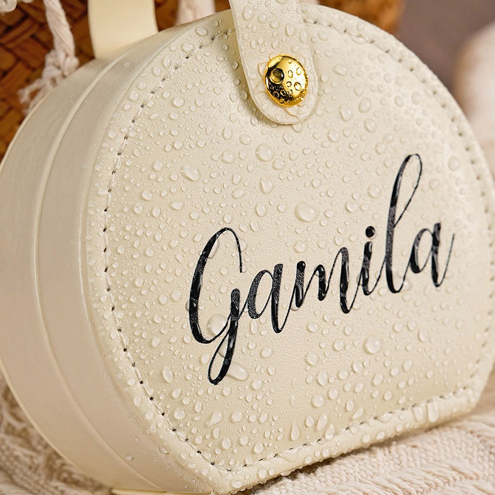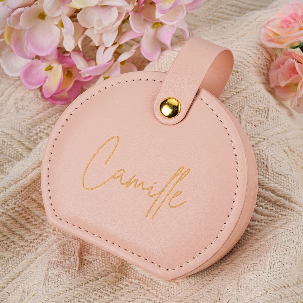 This jewelry box stands out with its special shape design, offering both a stylish appearance and space-saving convenience for your travel bag. You can customize it with your name, which makes this box more unique. We provide 3 fonts and 5 font colors for you, you can choose based on your preference.