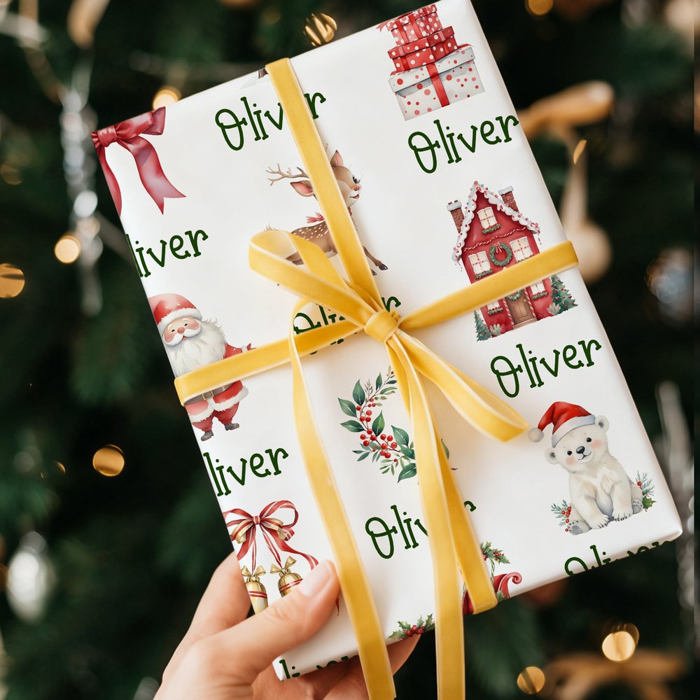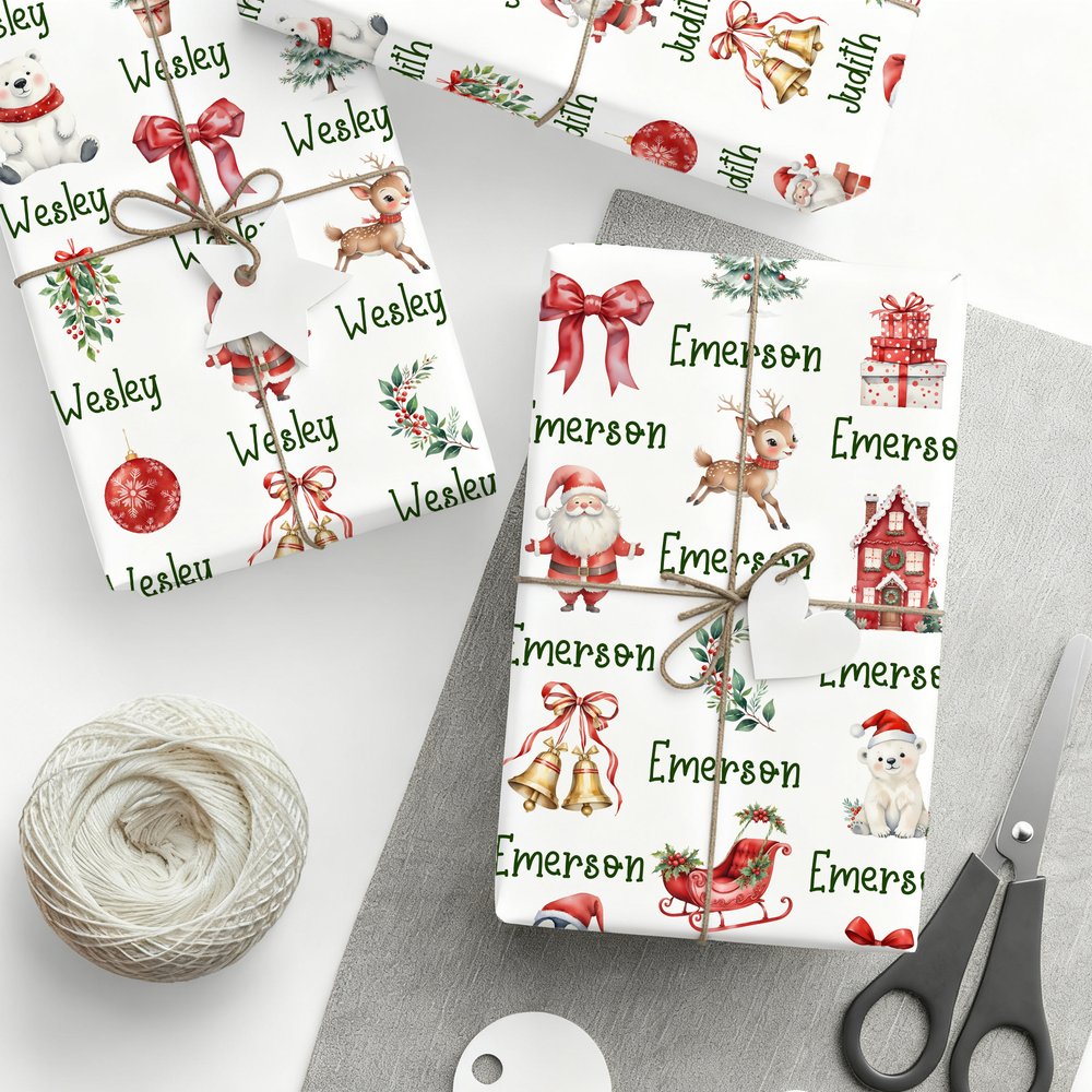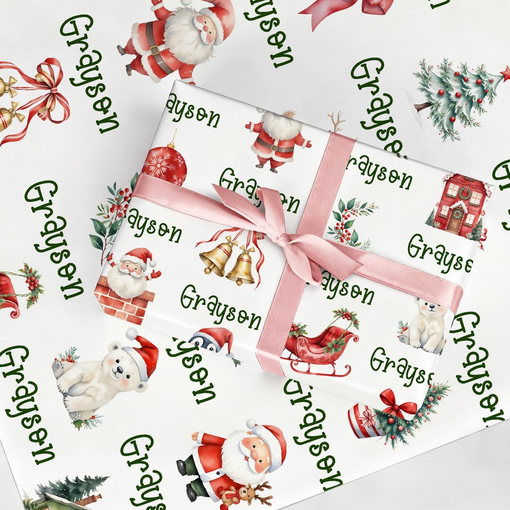 This Christmas-themed wrapping paper features festive images of Christmas trees, Santa Claus, reindeer, snowmen, and more, all personalized with your name. This thoughtful customization expresses a unique message of love and well-wishes. The vibrant and joyful patterns evoke a warm holiday spirit, ensuring every gift feels special and precious this Christmas.