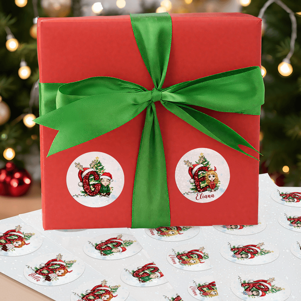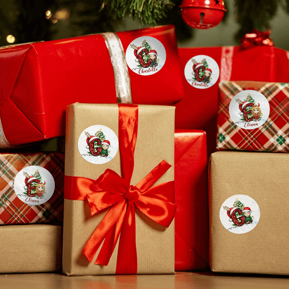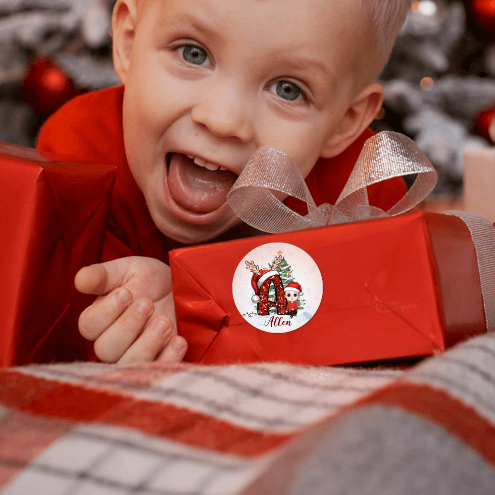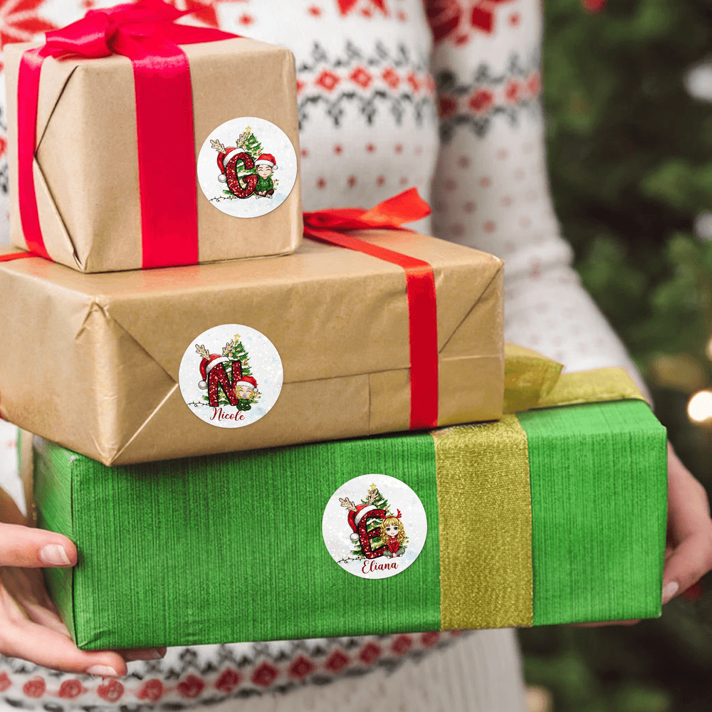 Personalized Santa Hat Initial Cartoon Character Glitter Stickers with Name Set of 2 Gift Decor Christmas Party Favors for Kids Family Friends