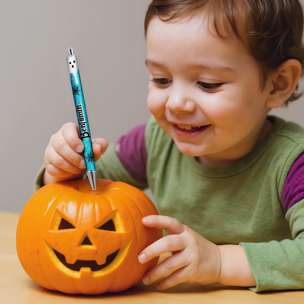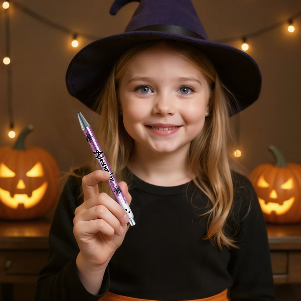 Our ballpoint pen features a vibrant, shimmering color scheme available in 10 colors, creating an eye-catching sight. The design exudes a festive sense of mystery and fun, featuring ghostly elements and spiderweb motifs, with a striking name centerpiece for customization, creating a writing instrument that's truly yours.