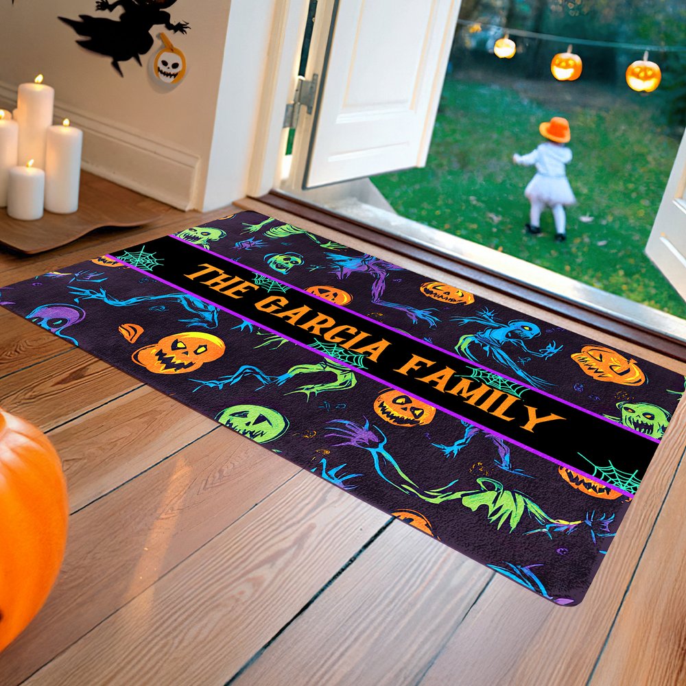 Featuring 12 iconic Halloween motifs, including jack-o'-lanterns, ghosts, spiderwebs, and more, this doormat cleverly blends edgy neon colors with classic holiday elements. This striking contrast instantly ignites the festive atmosphere. Customizable text adds a unique and personal touch to the mat, making it a memorable addition to any gathering.