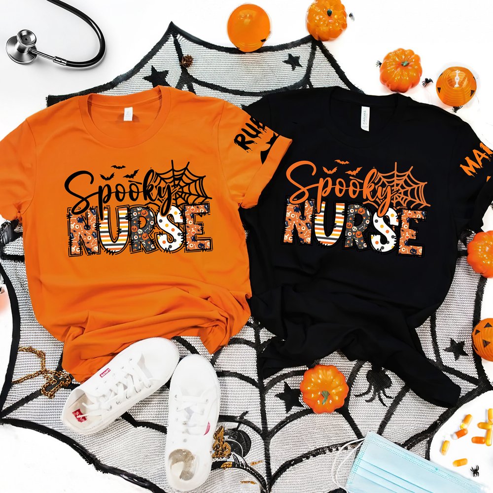 Our apparel features a whimsical "Spooky Nurse" slogan, or you can customize it with "Spooky XXX", which features Halloween-inspired graphics, including bats and spiderwebs, perfectly fitting the Halloween spirit. You can also customize your name on the sleeve to add a festive touch to any Halloween event.