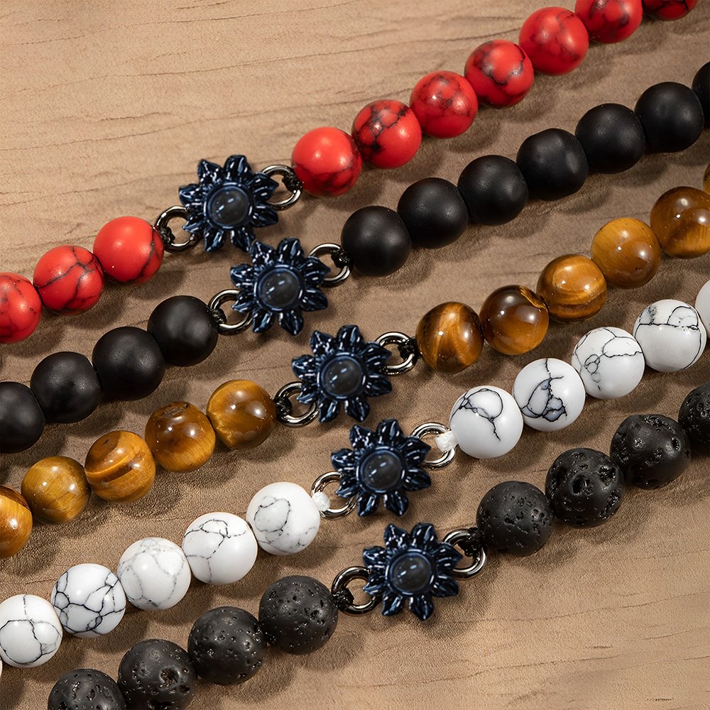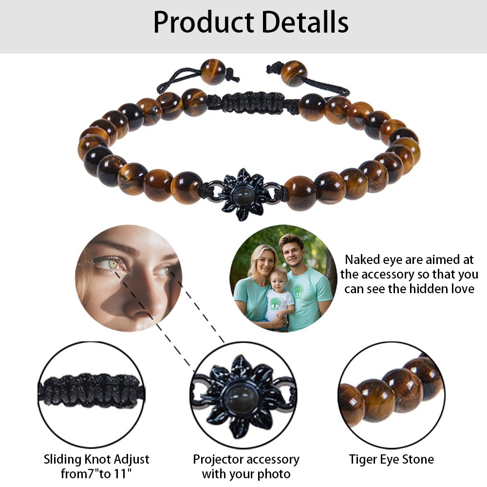 This bracelet features a beautifully crafted sunflower charm, symbolizing warmth, love, and happiness. The unique design blends natural tiger's eye stone beads with an innovative photo projection feature, allowing you to upload your favorite photos, including memories of your family, loved ones, friends, or pets, and cherish your fond memories and important moments with this bracelet.