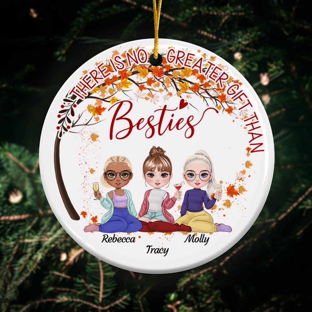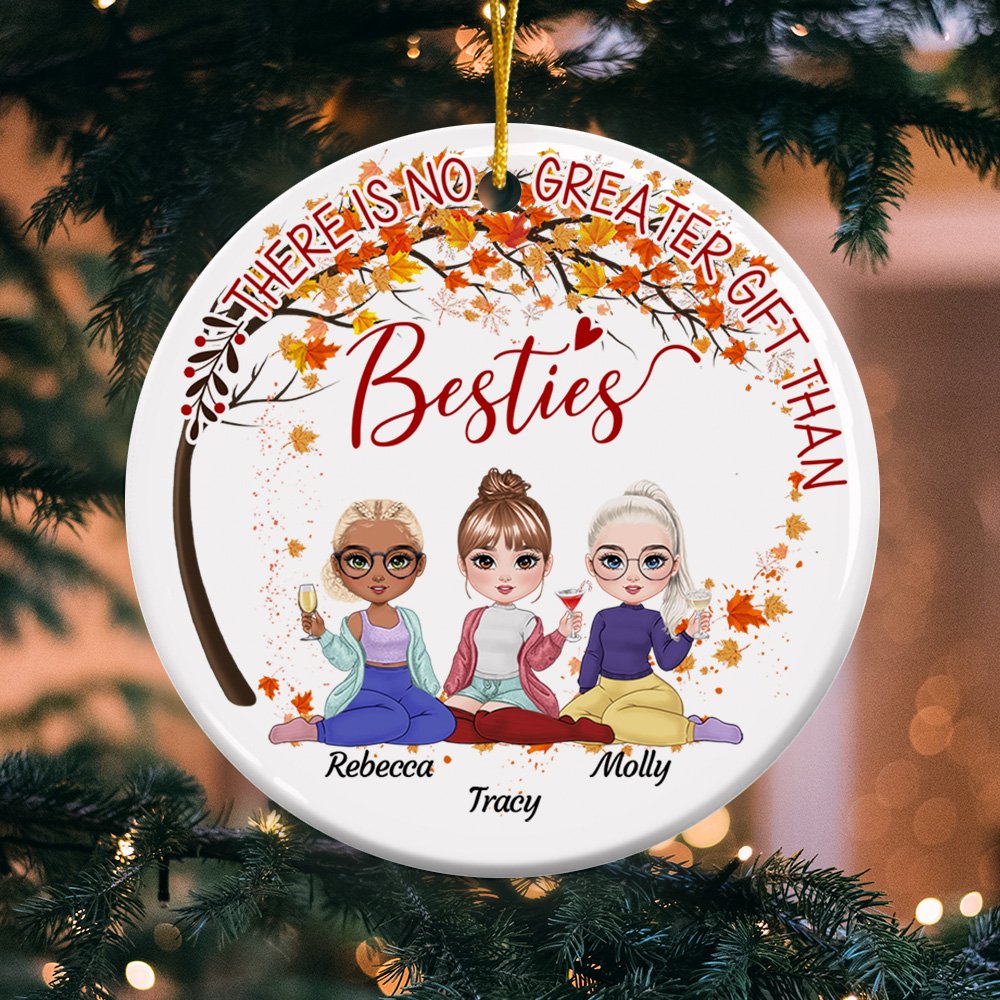 Designed for best friends, sisters, or female friends, this ornament is a beautiful way to show appreciation and love. The printed sentiment message "There Is No Greater Gift Than Besties" perfectly captures the bond you share, reminding your friends of your everlasting friendship every time they see it.