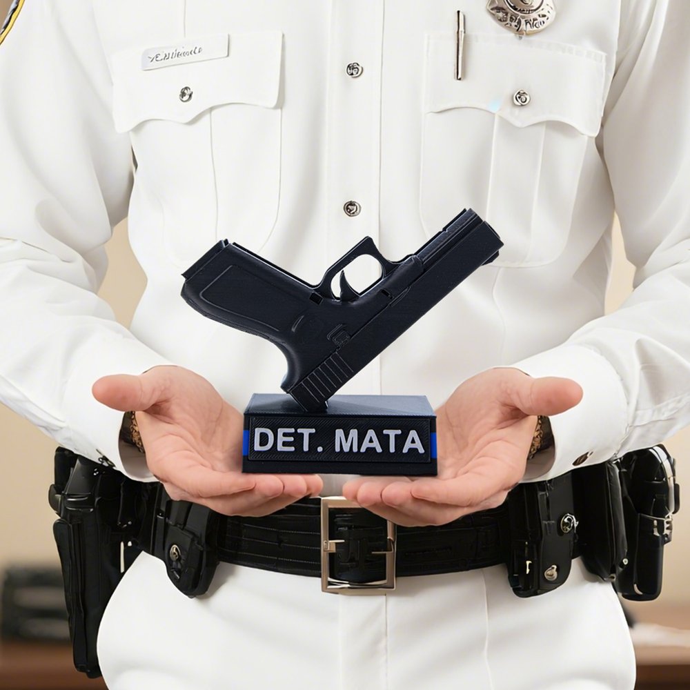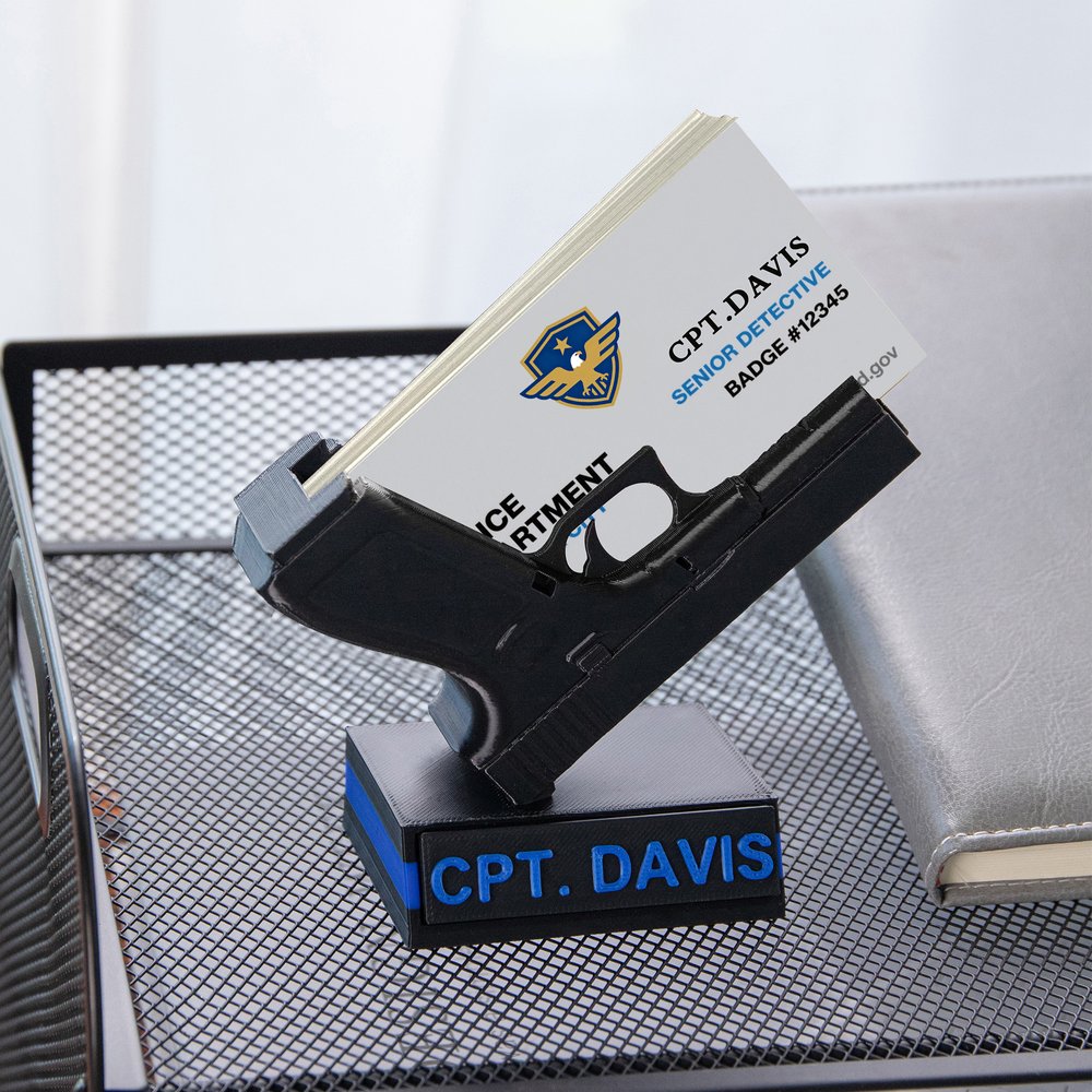 This striking piece features a pistol-shaped card holder, and the base is adorned with the iconic thin blue line, a symbol of police service and the risks and sacrifices faced by law enforcement officers in maintaining law and order. The base features a removable plate that can be customized with a message celebrating courage, dedication, and a tribute to heroes.