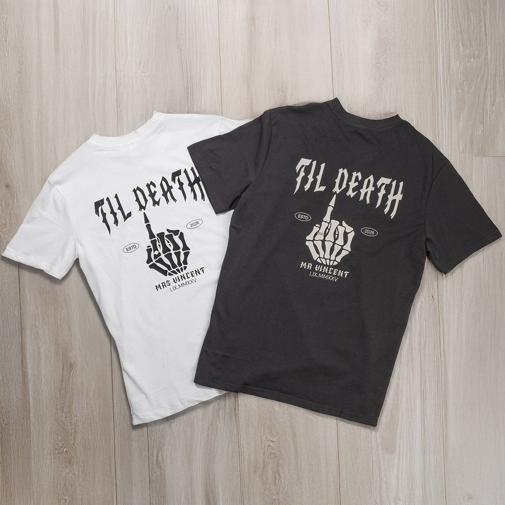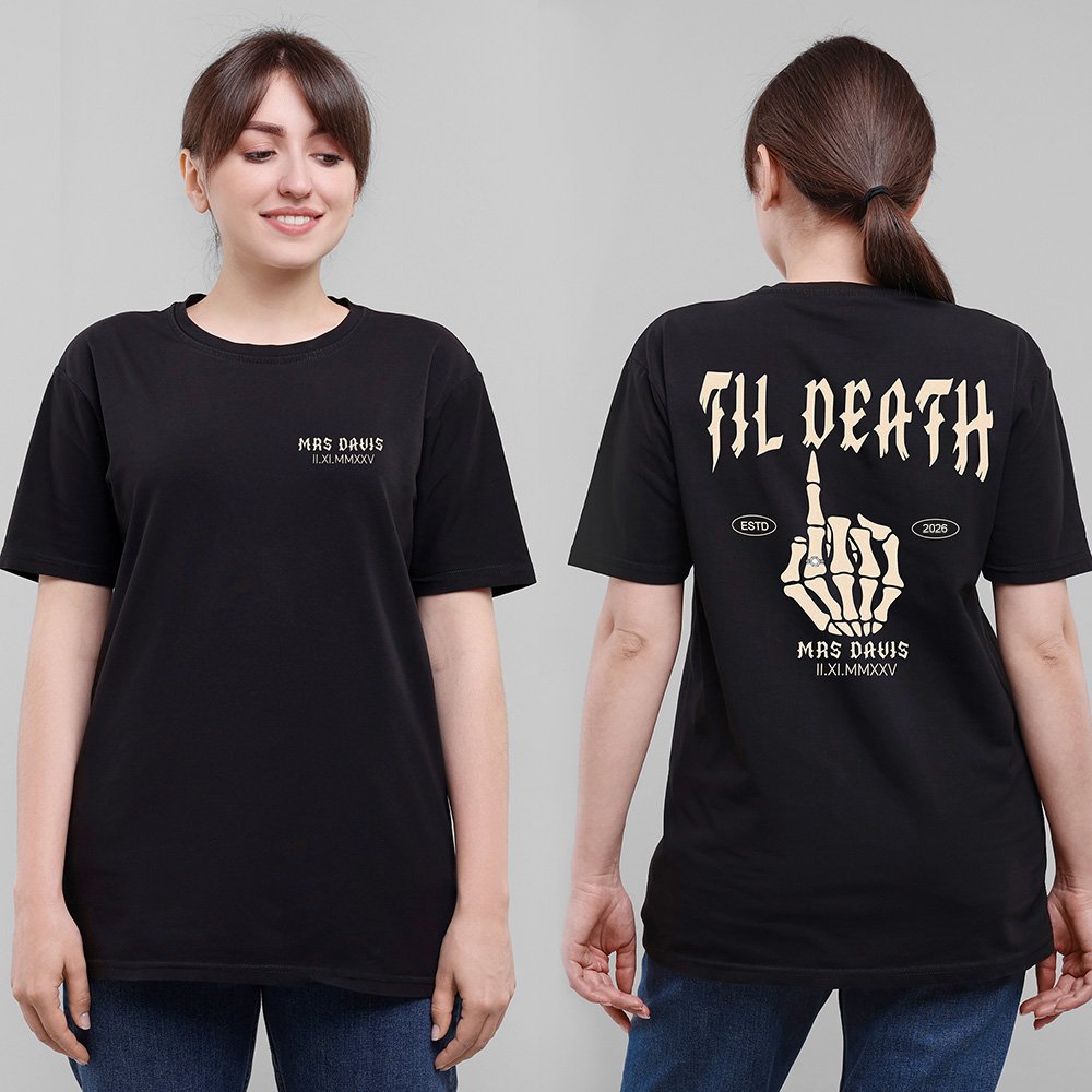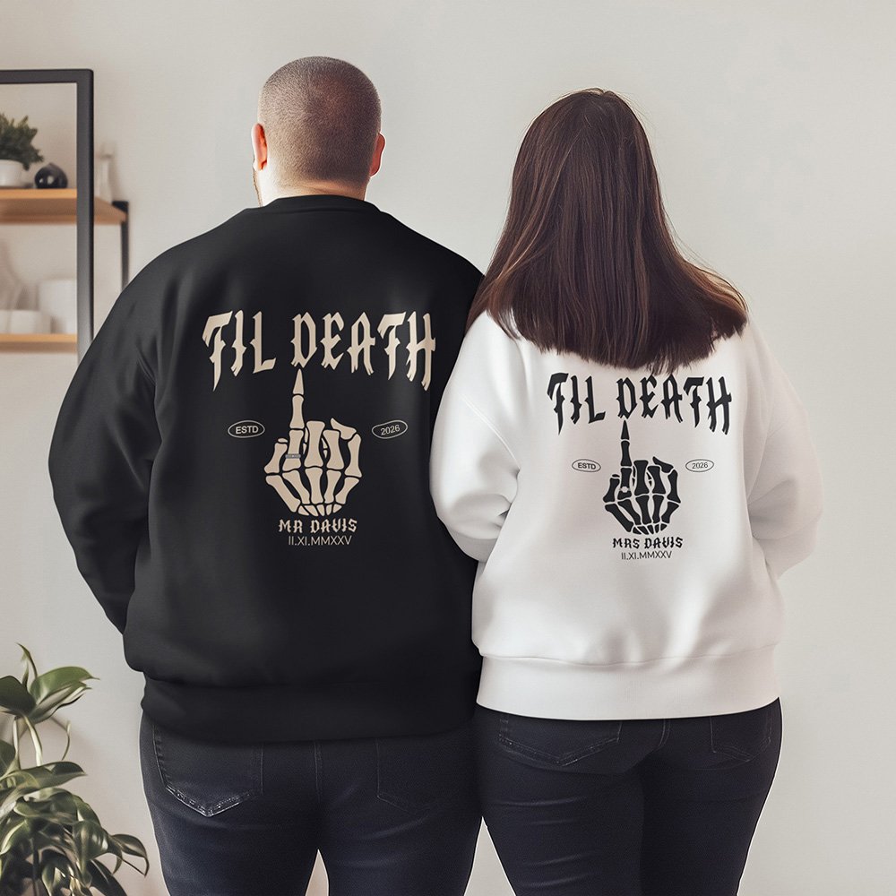 Personalized Til Death Skeleton Hand Soft Matching T-shirt Sweatshirt with Text and Year Anniversary Valentine's Day Gift for Newlywed Couple