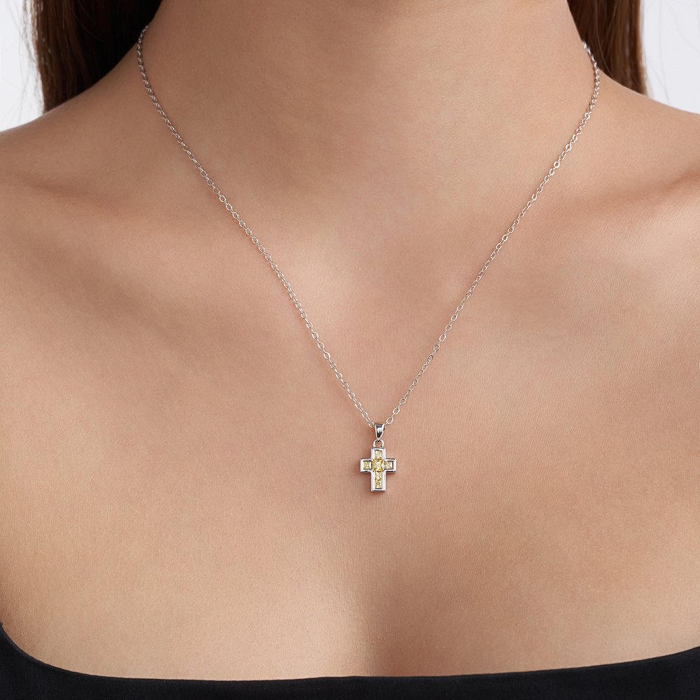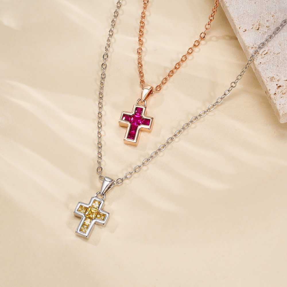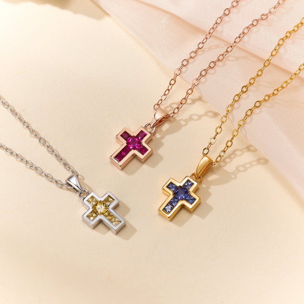 This necklace features a striking, tiny cross design. Each necklace can be decorated with your preferred birthstone, symbolizing the wearer's unique qualities, such as sapphires, symbolizing wisdom and loyalty, and rubies, symbolizing passion and love. Create a necklace that is truly unique to you.