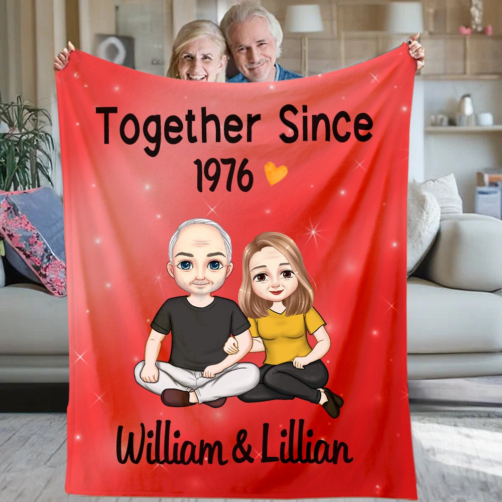 Celebrate your love story with this heartwarming personalized throw blanket. Featuring a couple of cartoon characters designed to resemble you and your partner, along with your names and the year you got together, this blanket beautifully captures your unique journey.