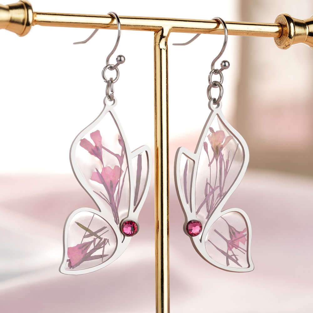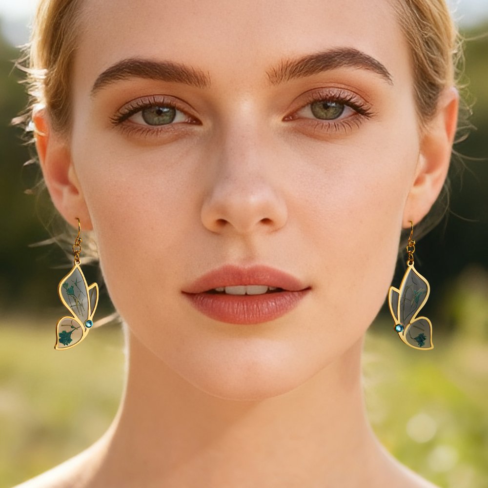 Step into a world of enchantment with our exquisite butterfly-inspired earrings. Each pair is a delicate masterpiece, showcasing the elegance of nature's most captivating creatures. The earrings feature a transparent resin panel framed by a delicate gold or silver butterfly silhouette, encasing real dried flowers that retain their natural vibrancy, as if a secret garden has been captured within. The addition of sparkling birthstones adds a touch of sophistication and exclusivity, making these earrings truly unique.