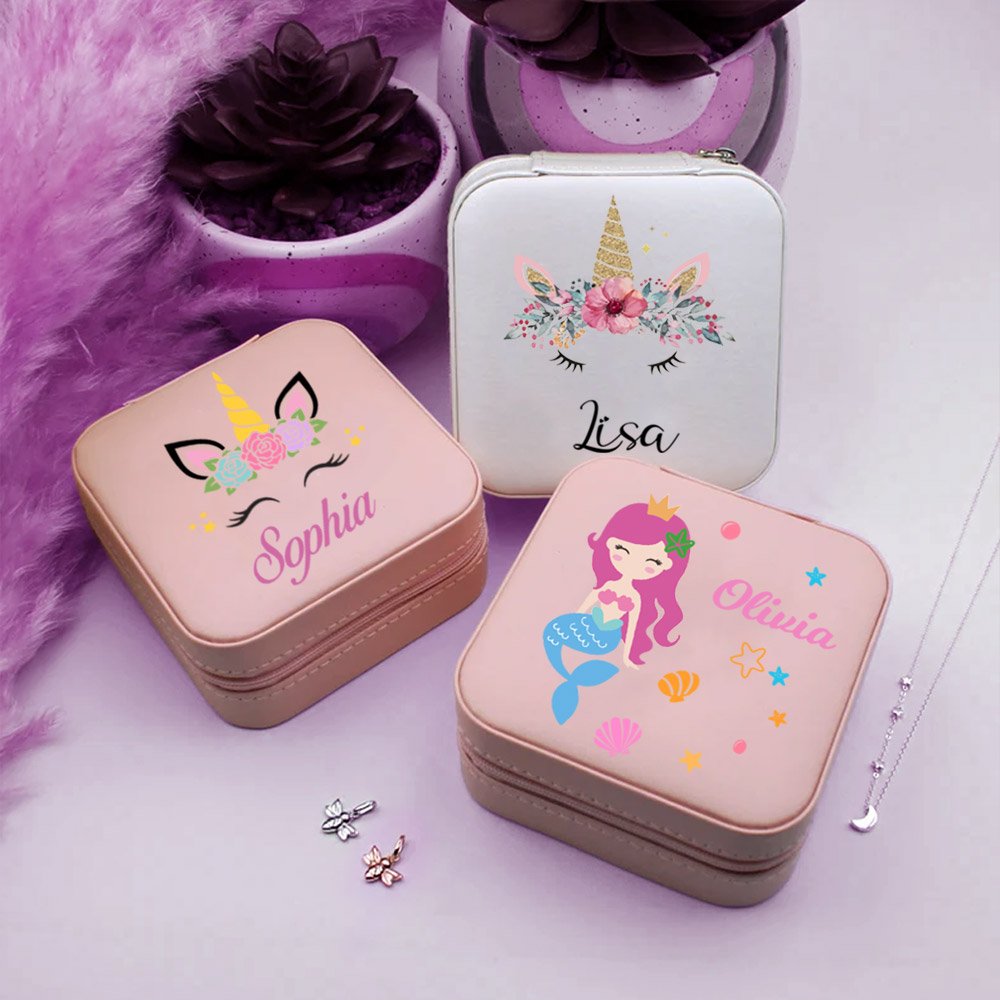 The girl jewelry box contains sponge strips for rings/studs, 4 compartment dividers, elastic pocket for chains. Bracelets and small accessories like lipstick, brooches, and watches can also be kept.