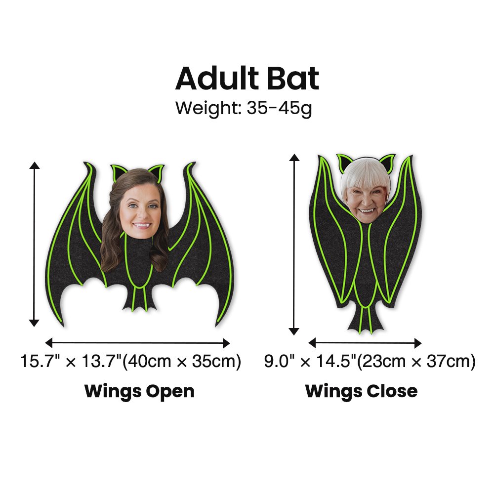 | Measurement: | Adult Bat Wings Open - 15.7" Γ 13.7"(40cm Γ 35cm) Adult Bat Wings Close - 9.0" Γ 14.5"(23cm Γ 37cm) Baby Bat Wings Open - 15.7" Γ 8.6"(40cm Γ 22cm) Baby Bat Wings Close - 6.6" Γ 9.4"(17cm Γ 24cm) |