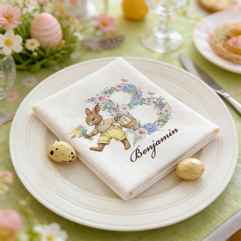 Featuring an Easter theme, this design incorporates names, Easter eggs, Easter bunnies, initials, and floral elements, using a watercolor style to create a spring-inspired floral initial design. It features bunnies in various poses and clothing colors, creating a vibrant and festive atmosphere. Personalized name customization is available, allowing each family member or guest to feel a special, personal touch.