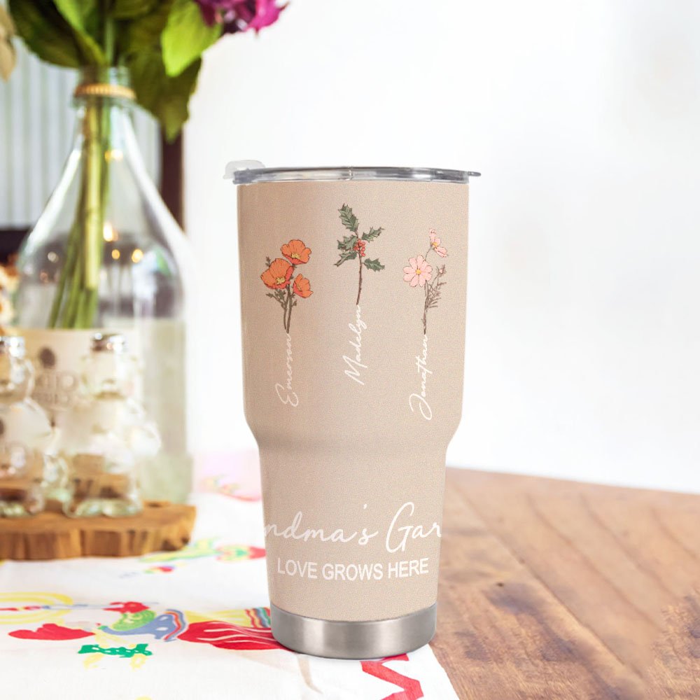 This tumbler showcases a captivating watercolor birth flower design, adding a touch of elegance and charm. Each tumbler is adorned with the recipient's birth flower, symbolizing their unique qualities and celebrating their birth month. The vibrant colors and delicate details of the watercolor design make this tumbler a true work of art. The tender phrase "Love Grows Here" adds an endearing touch, making this tumbler not just a decoration but a heartfelt expression of love and warmth.