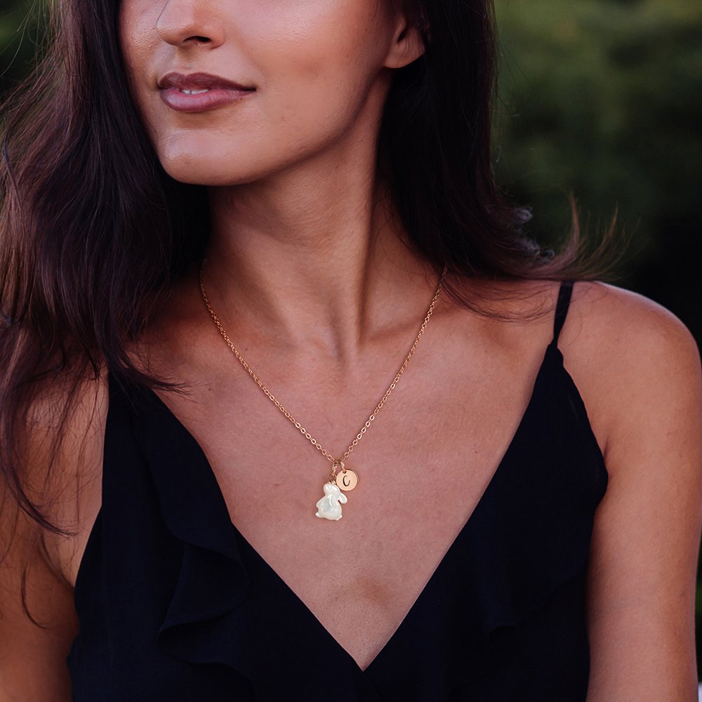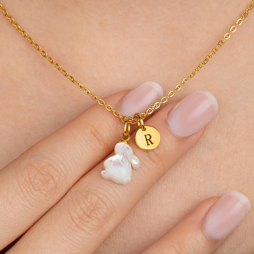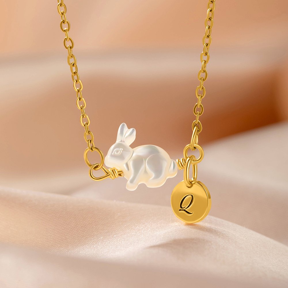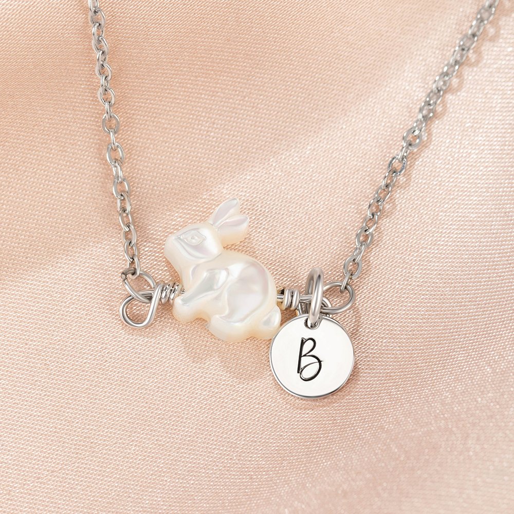 This charming white shell rabbit necklace features an intricately designed rabbit pendant, symbolizing good luck and whimsical charm. Each necklace is customizable with an initial on small, shiny discs, adding a personal and meaningful touch.
