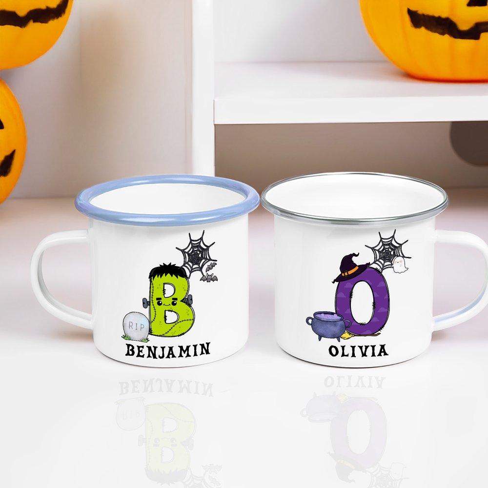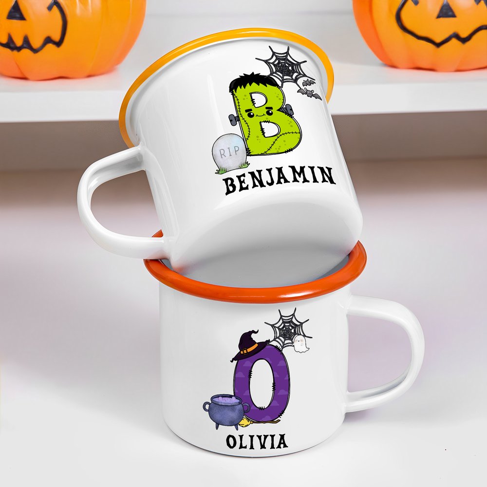 Our enamel mugs are adorned with festive lettering, featuring witch, frank, and pumpkin motifs, creating a delightful Halloween theme. Customizing with your child's name is fun and engaging, enhancing the festive atmosphere and adding a touch of festive flair to any Halloween event.