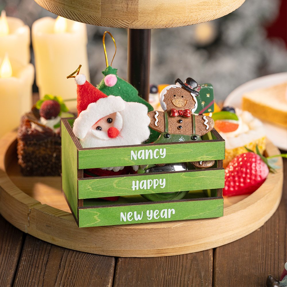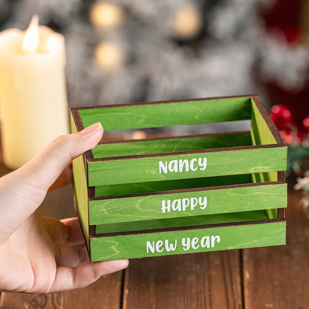 Embrace the festive spirit with our candy crate. Featuring a charming Christmas-themed design in red and green, this crate delivers a warm holiday atmosphere. It can be customized with 1-3 lines of text, such as names or heartfelt messages, making it a truly personal gift for any occasion.