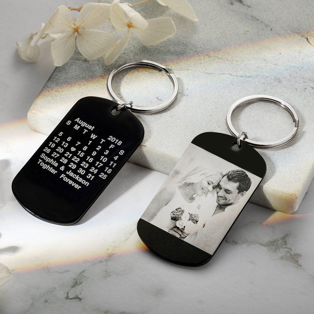 •This dog tag photo keychain by Callie is a classic style gift for men. Carry cherished memories with you at all times. Names, calendar, words and photos you cherished are all presented on the keychain. Preserve your special memories in precious metal FOREVER.